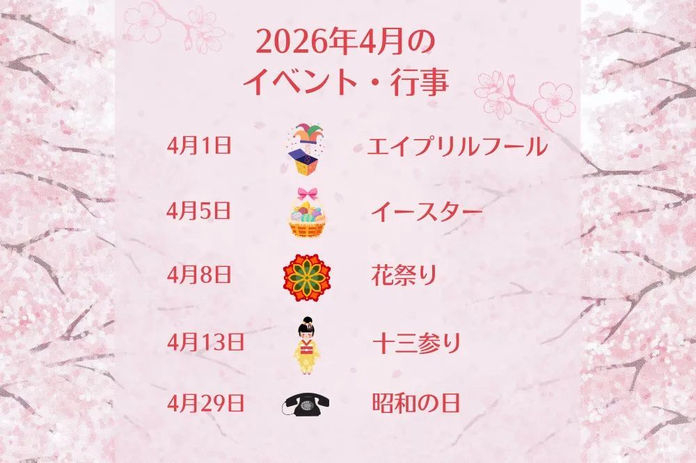 エイプリルフール(4月1日)、イースター(2026年は4月5日)、桜、お花見、新生活、花祭り(4月8日)、入園式・入学式、新学期・新年度、チューリップ、桜餅、十三参り(4月13日)、菜の花、潮干狩り、昭和の日(4月29日)、卯月(うづき)などなど、4月を代表する行事や文化が盛りだくさん!