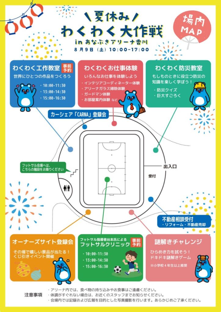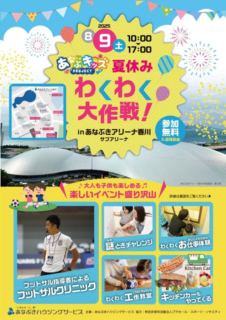 本イベント「夏休みワクワク大作戦inあなぶきアリーナ香川」では、フットサルクリニックや、工作教室や謎解きチャレンジ、わくわく防災教室など、親子で楽しめる多彩なプログラムが実施されました。
