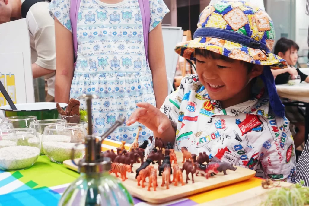 エコバッグ工作ではカラーペンを使用し、グラスガーデンの工作ではさまざまな種類の素材を使用しますが、必要な道具がすべてそろった「レンタル道具セット」をご活用いただくことで、クライアントさまには机とイスをご用意いただくだけで、本格的な工作イベントを実現することができました。